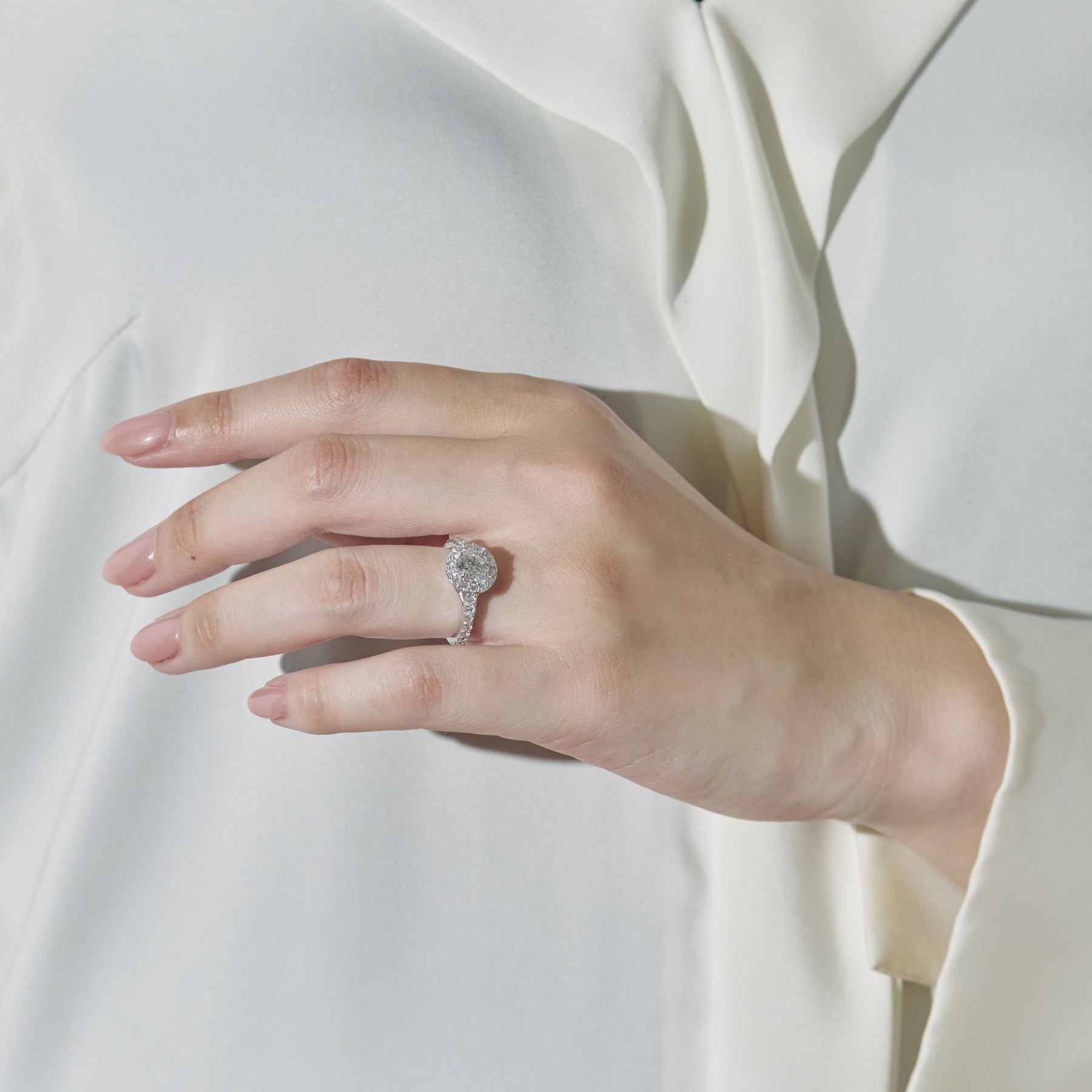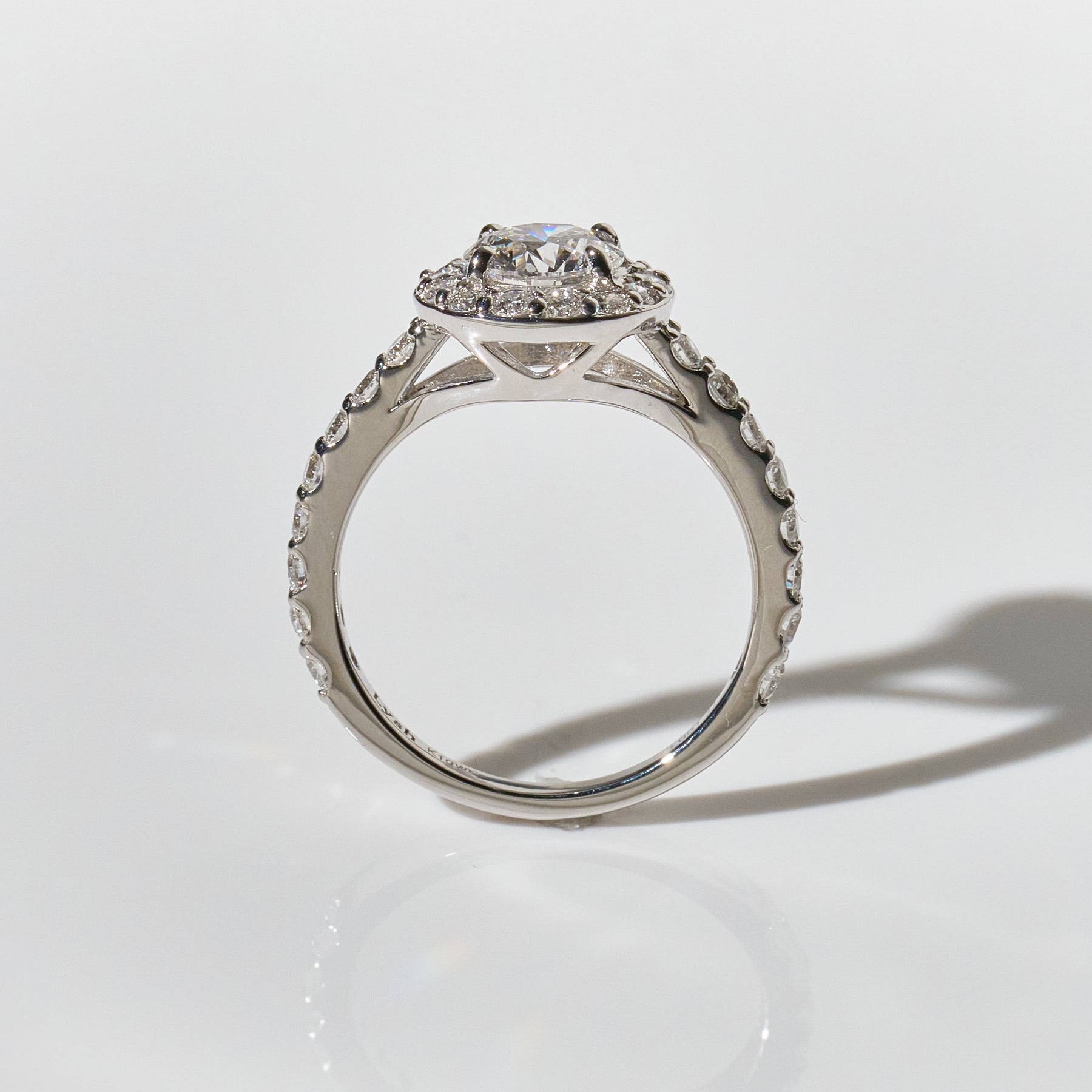 1ctの大粒のダイヤの周りを1周ぐるりと小粒ダイヤで囲ったヘイローリング。リングアームにもダイヤを施しており、圧倒的な存在感と華やかさを放ちます。横顔を見ると建築的なフォルムで石を支えており、どこから見ても美しいリングです。センターの石はDカラーの最高グレードのラボグロウンダイヤモンド、周囲を囲う石もVSクラスのハイグレードなラボグロウンダイヤモンドで、素晴らしい輝きです。婚約指輪としてもお選びいただくことができます。